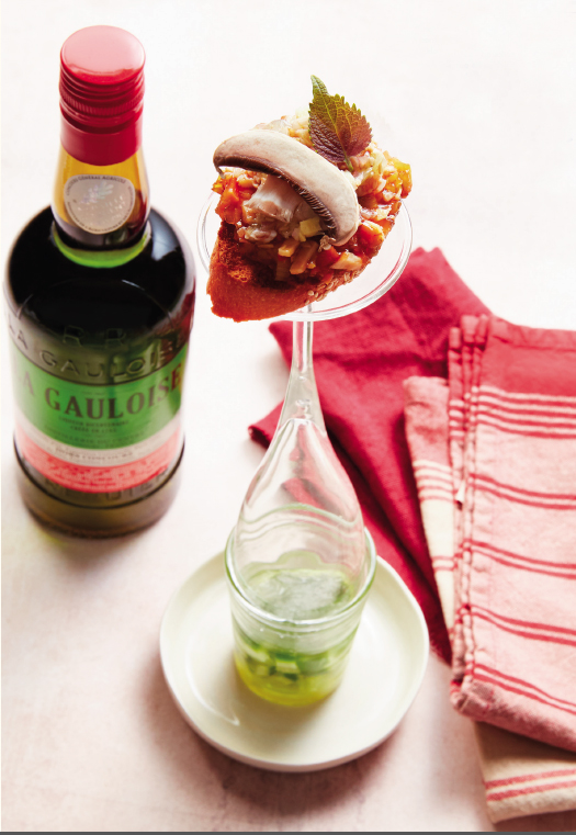La Distillerie du Centre a proposé aux Chefs Estelle et Didier Palard, du Restaurant Le Cheverny à Limoges, d’élaborer un amuse-bouche pour accompagner le "Gaulito", Mojito à LA GAULOISE verte.